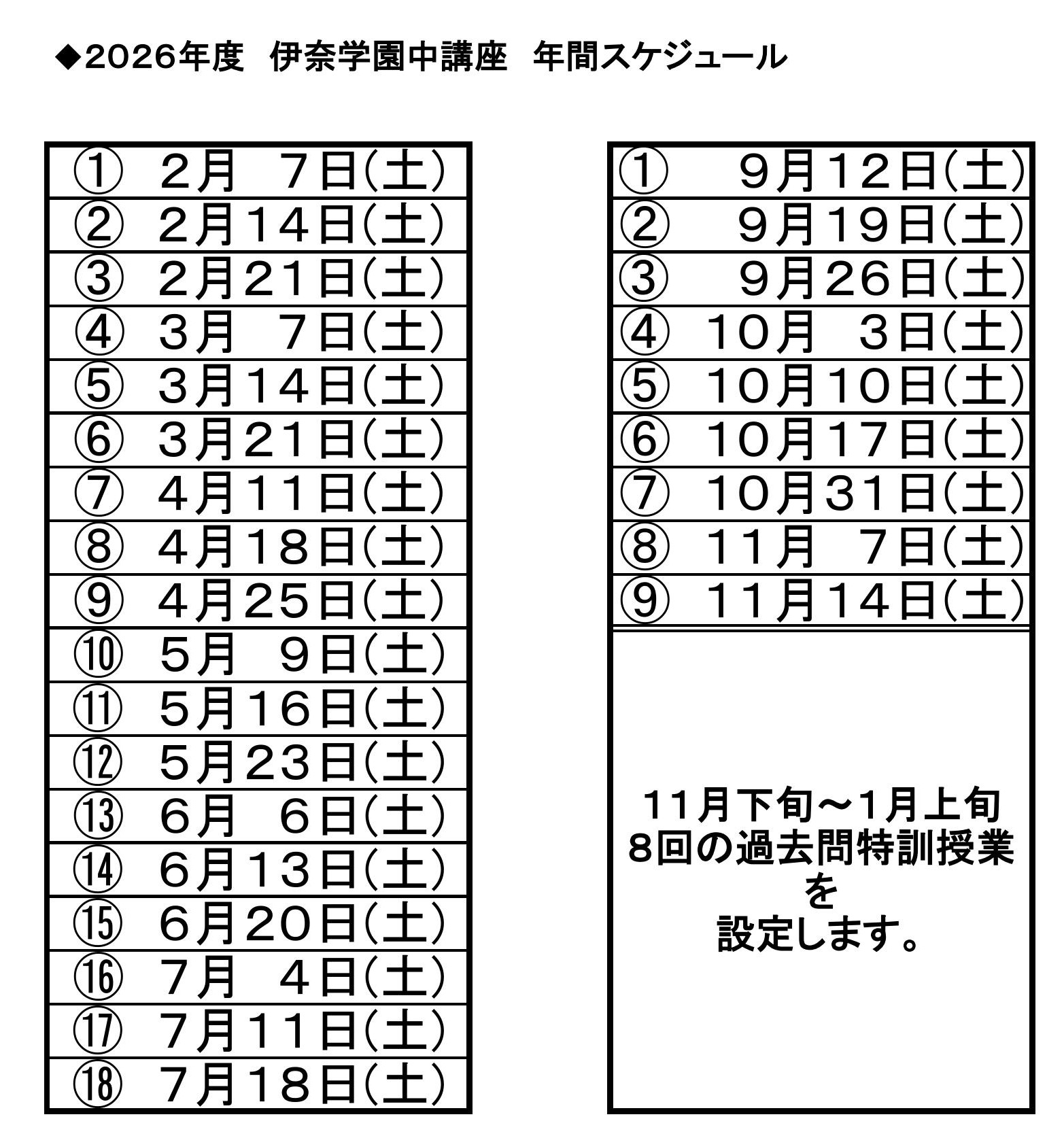 2026年度は2/7(土)から始まります。年間スケジュールは下記の通りです。
